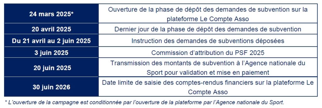 Attention, les structures ayant bénéficié d’une subvention dans le cadre du PSF 2024 devront avoir déposé le bilan de leurs actions 2024 au moment de leur demande 2025 directement sur la plateforme Compte Asso.