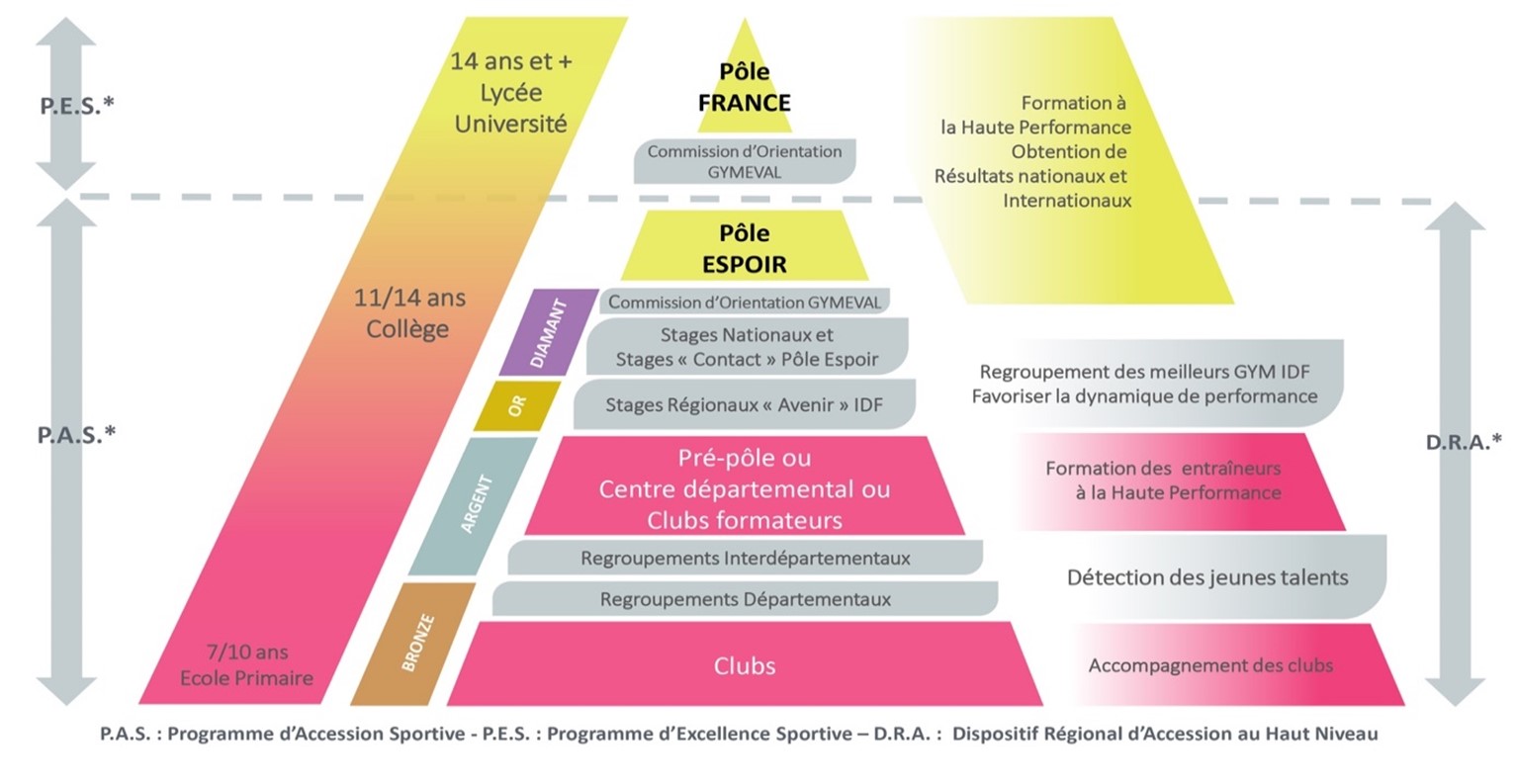 Le secteur jeunesse PAS vise la formation de base des gymnastes qui se destinent à la pratique de performance. Il permet également de détecter le potentiel de chacune et d’identifier celles qui apparaissent motivées par le haut-niveau. Afin de rendre plus lisible le parcours de la détection, chaque niveau correspondra à une couleur et aura un programme technique spécifique (voir schéma ci-dessous).